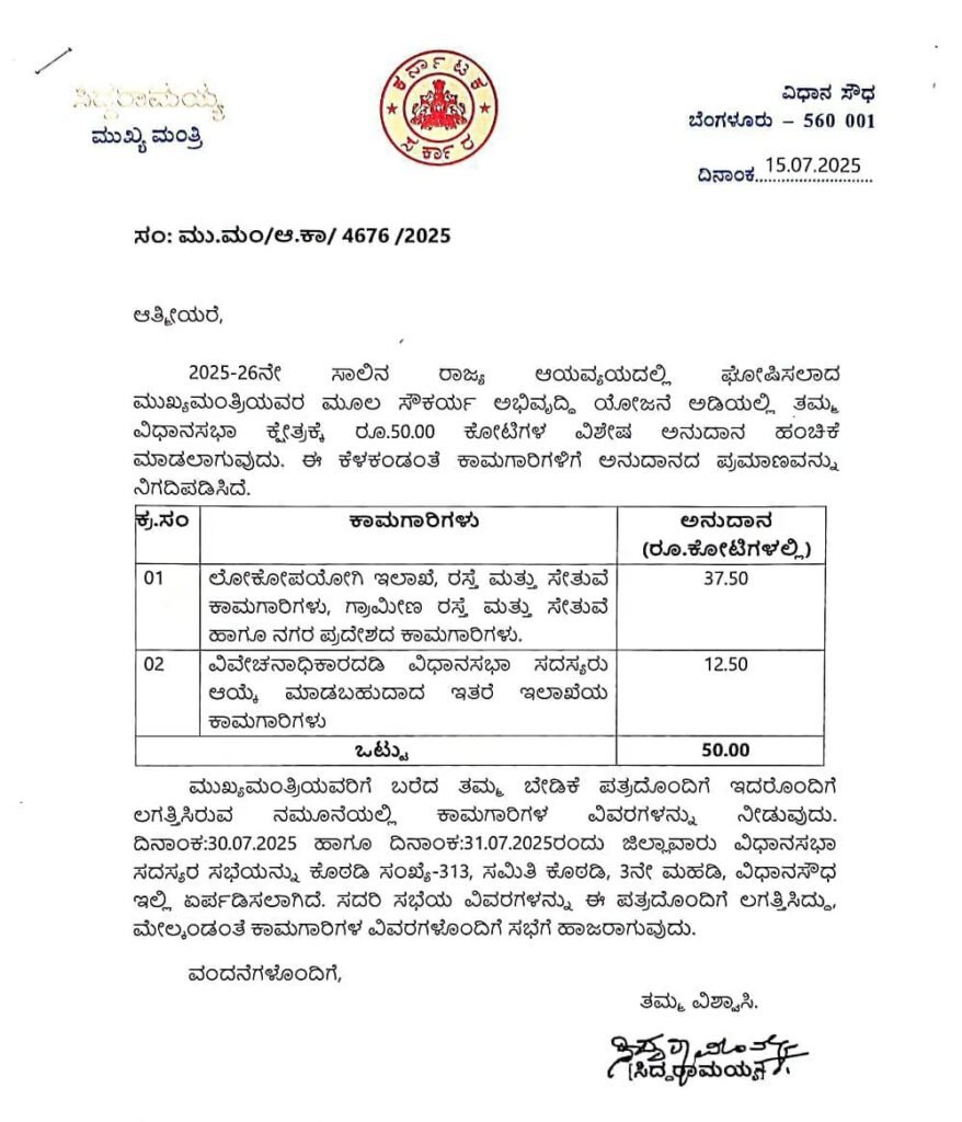 ‘2025-26 ಸಾಲಿನ ರಾಜ್ಯ ಆಯವ್ಯಯದಲ್ಲಿ ಘೋಷಿಸಲಾದ ಮುಖ್ಯಮಂತ್ರಿಯವರ ಮೂಲ ಸೌಕರ್ಯ ಅಭಿವೃದ್ಧಿ ಯೋಜನೆ ಅಡಿಯಲ್ಲಿ ತಮ್ಮ ವಿಧಾನಸಭಾ ಕ್ಷೇತ್ರಕ್ಕೆ 50 ಕೋಟಿ ರೂ.ಗಳ ವಿಶೇಷ ಅನುದಾನ ಹಂಚಿಕೆ ಮಾಡಲಾಗುವುದು. ಮುಖ್ಯಮಂತ್ರಿಯವರಿಗೆ ಬರೆದ ತಮ್ಮ ಬೇಡಿಕೆ ಪತ್ರದೊಂದಿಗೆ, ಇದರೊಂದಿಗೆ ಲಗತ್ತಿಸಿರುವ ನಮೂನೆಯಲ್ಲಿ ಕಾಮಗಾರಿಗಳ ವಿವರಗಳನ್ನು ನೀಡುವುದು. ದಿನಾಂಕ:30.07.2025 ಹಾಗೂ ದಿನಾಂಕ:31.07.2025ರಂದು ಜಿಲ್ಲಾವಾರು ವಿಧಾನಸಭಾ ಸದಸ್ಯರ ಸಭೆಯನ್ನು ಕೊಠಡಿ ಸಂಖ್ಯೆ-313, ಸಮಿತಿ ಕೊಠಡಿ, 3ನೇ ಮಹಡಿ, ವಿಧಾನಸೌಧ ಇಲ್ಲಿ ಏರ್ಪಡಿಸಲಾಗಿದೆ. ಸದರಿ ಸಭೆಯ ವಿವರಗಳನ್ನು ಈ ಪತ್ರದೊಂದಿಗೆ ಲಗತ್ತಿಸಿದ್ದು, ಮೇಲ್ಕಂಡಂತೆ ಕಾಮಗಾರಿಗಳ ವಿವರಗಳೊಂದಿಗೆ ಸಭೆಗೆ ಹಾಜರಾಗುವುದು’ ಎಂದು ಸಿದ್ದರಾಮಯ್ಯ ಅವರ ಆದೇಶ ಪತ್ರದಲ್ಲಿ ಉಲ್ಲೇಖಿಸಲಾಗಿದೆ.