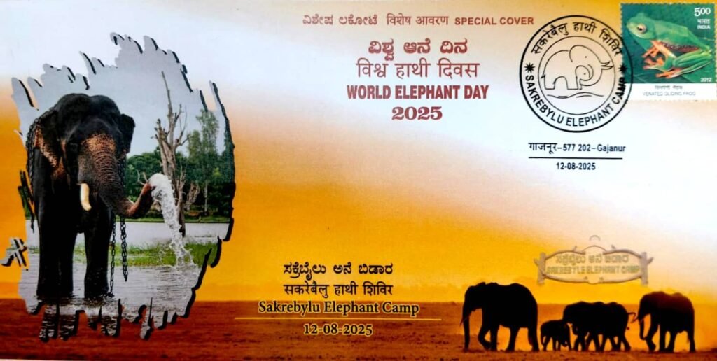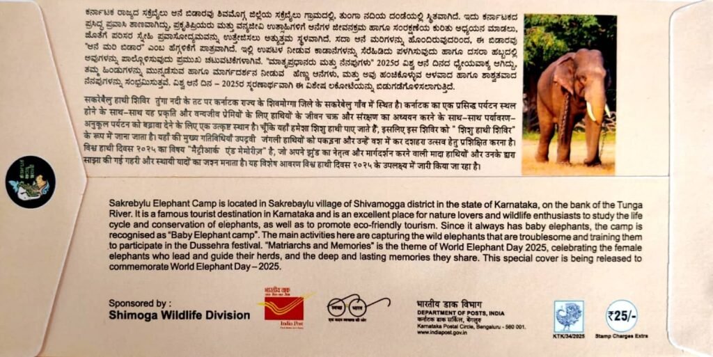 2025 ರ ವಿಶ್ವ ಆನೆ ದಿನದ ಸಂದರ್ಭದಲ್ಲಿ, ಭಾರತೀಯ ಅಂಚೆ ಇಲಾಖೆ ಶಿವಮೊಗ್ಗ ಅರಣ್ಯ ಇಲಾಖೆ ಸಹಯೋಗದೊಂದಿಗೆ ಆನೆ ಬಿಡಾರ ಶಿಬಿರದಲ್ಲಿ ವಿಶೇಷ ಅಂಚೆ ಲಕೋಟೆಯನ್ನು ಬಿಡುಗಡೆ ಮಾಡಿತು.