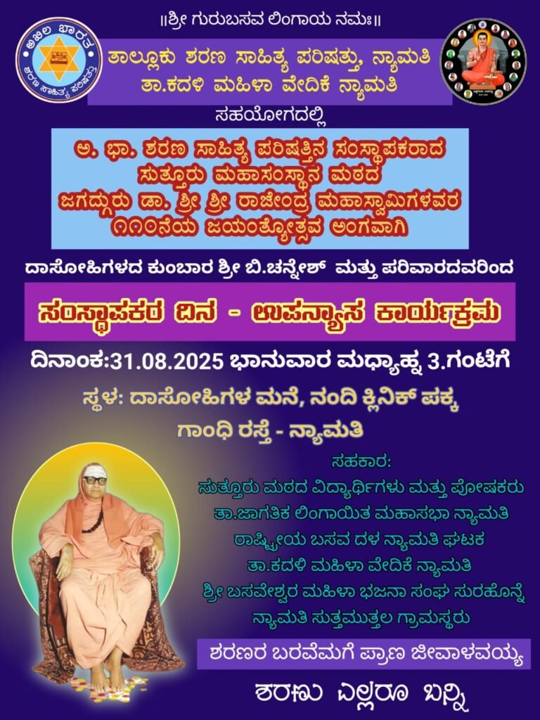 ನ್ಯಾಮತಿ: ತಾಲ್ಲೂಕು ಶರಣ ಸಾಹಿತ್ಯ ಪರಿಷತ್ತು, ತಾಲ್ಲೂಕು ಕದಳಿ ಮಹಿಳಾ ವೇದಿಕೆ ಸಹಯೋಗದಲ್ಲಿ, ಆ.ಭಾ. ಶರಣ ಸಾಹಿತ್ಯ ಪರಿಷತ್ತಿನ ಸಂಸ್ಥಾಪಕರಾದ ಜಗದ್ಗುರು ಡಾ.ಶ್ರೀ ರಾಜೇಂದ್ರ ಮಹಾಸ್ವಾಮಿಗಳ ಜಯಂತ್ಯೋತ್ಸವ ಅಂಗವಾಗಿ “ಸಂಸ್ಥಾಪಕರ ದಿನ ಹಾಗೂ ಉಪನ್ಯಾಸ ಕಾರ್ಯಕ್ರಮ” ನಡೆಯಲಿದೆ.