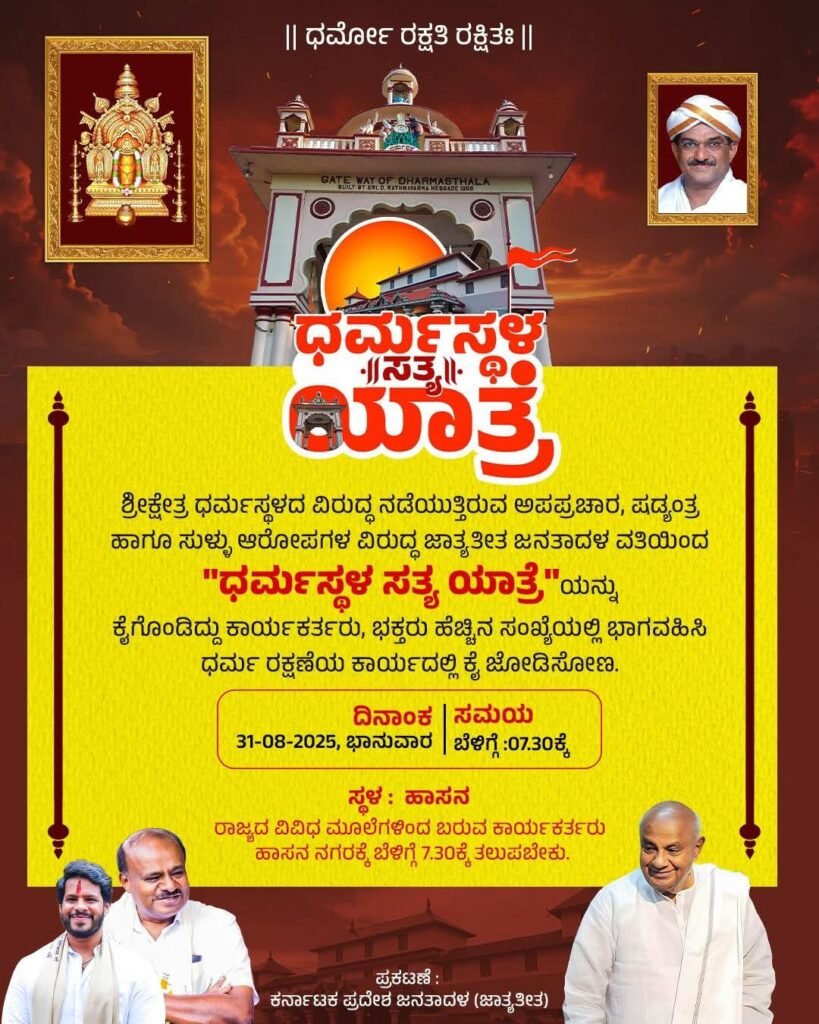 ಶಿವಮೊಗ್ಗ: ಶ್ರೀ ಕ್ಷೇತ್ರ ಧರ್ಮಸ್ಥಳದ ಬಗ್ಗೆ ಸಾಮಾಜಿಕ ಜಾಲತಾಣಗಳಲ್ಲಿ ಹಾಗೂ ಕೆಲವು ಮಾಧ್ಯಮಗಳಲ್ಲಿ ಹರಡುತ್ತಿರುವ ಸುಳ್ಳು ಸುದ್ದಿಗಳಿಗೆ ಕಡಿವಾಣ ಹಾಕುವ ಉದ್ದೇಶದಿಂದ ಜನತಾ ದಳ (ಜೆಡಿಎಸ್) ಕಾರ್ಯಕರ್ತರು ಮತ್ತು ನಾಯಕರು ಇಂದು ಶಿವಮೊಗ್ಗದಿಂದ “ಶ್ರೀ ಕ್ಷೇತ್ರ ಧರ್ಮಸ್ಥಳ ಸತ್ಯಯಾತ್ರೆ” ಪ್ರಾರಂಭಿಸಿದ್ದಾರೆ.