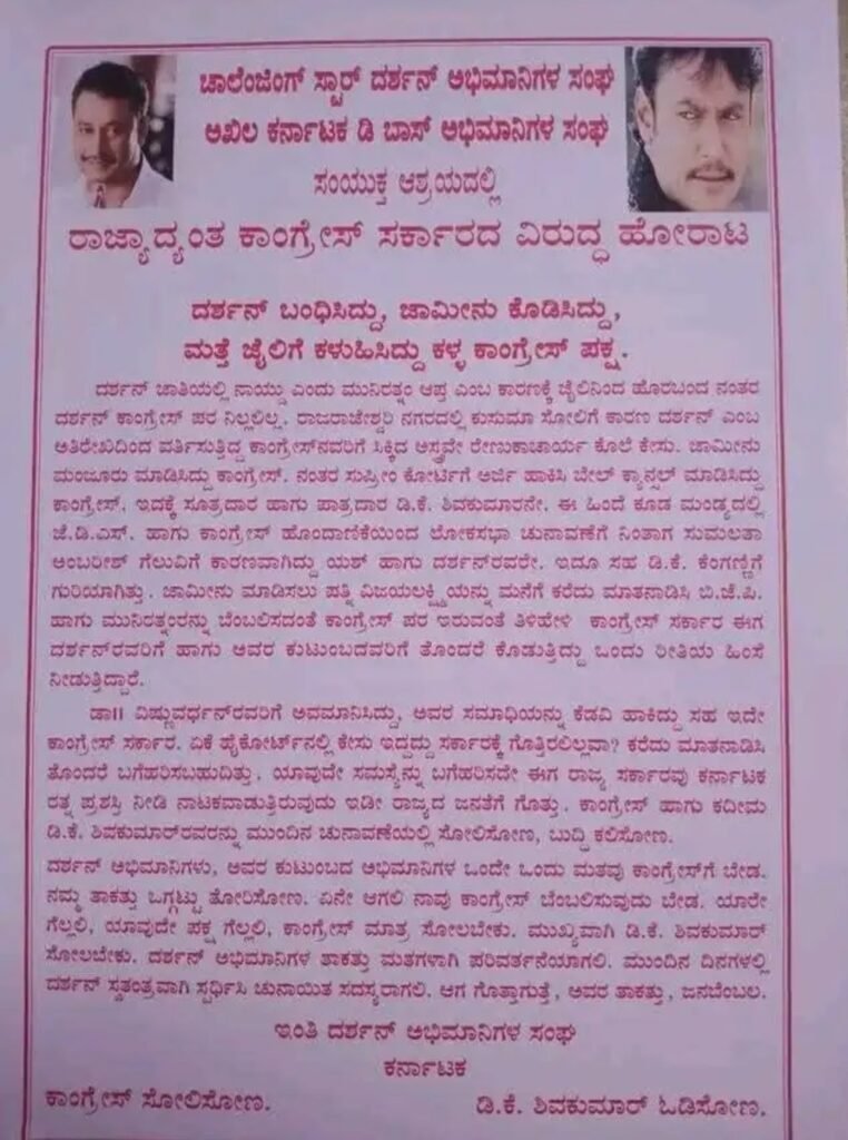 ದರ್ಶನ್ ಅವರನ್ನು ಬಂಧಿಸಿ, ನಂತರ ಸುಪ್ರೀಂ ಕೋರ್ಟ್ನಲ್ಲಿ ಜಾಮೀನು ರದ್ದುಪಡಿಸಲು ಮುಂದಾದದ್ದು “ಕಳ್ಳ ಕಾಂಗ್ರೆಸ್ ಪಕ್ಷದ ರಾಜಕೀಯ ಆಟ” ಎಂದು ಅಭಿಮಾನಿ ಸಂಘಟನೆಗಳು ಆರೋಪಿಸಿವೆ. ಅಭಿಮಾನಿಗಳ ಪ್ರಕಾರ, ದರ್ಶನ್ ನಾಯ್ಡು ಸಮುದಾಯದವರಾಗಿರುವುದು ಹಾಗೂ ಮುನಿರತ್ನ ಅವರ ಹತ್ತಿರದವರಾಗಿರುವುದು ಕಾಂಗ್ರೆಸ್ ನಾಯಕರ ಅಸಹನೆಯ ಮೂಲವಾಗಿದೆ. ಜೈಲಿನಿಂದ ಬಿಡುಗಡೆಯಾದ ಬಳಿಕ ದರ್ಶನ್ ಅವರು ಕಾಂಗ್ರೆಸ್ ಪರ ನಿಂತಿರಲಿಲ್ಲ ಎಂಬ ಕಾರಣದಿಂದ ರಾಜರಾಜೇಶ್ವರಿ ನಗರದಲ್ಲಿ ಕುಸುಮಾ ಸೋಲಿಗೆ ಅವರನ್ನೇ ಕಾರಣವೆಂದು ಕಾಂಗ್ರೆಸ್ ರಾಜಕೀಯ ವಲಯಗಳು ಆರೋಪಿಸಿವೆ. ಅಭಿಮಾನಿ ಸಂಘಟನೆಯ ಮಾತಿನ ಪ್ರಕಾರ, “ರೇಣುಕಾಸ್ವಾಮಿ ಹತ್ಯೆ ಪ್ರಕರಣವನ್ನು ರಾಜಕೀಯ ಹಸ್ತಕ್ಷೇಪದ ಸಾಧನವಾಗಿ ಬಳಸಿಕೊಂಡು, ದರ್ಶನ್ ಅವರನ್ನು ಗುರಿಯಾಗಿಸುವ ಪ್ರಯತ್ನ ಕಾಂಗ್ರೆಸ್ ನಾಯಕರಿಂದ ನಡೆಯುತ್ತಿದೆ” ಎಂದು ತೀವ್ರ ಆಕ್ರೋಶ ವ್ಯಕ್ತವಾಗಿದೆ.