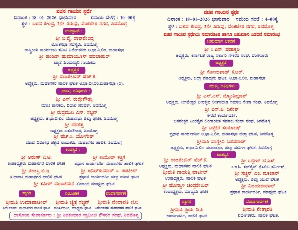 ಈ ಕಾರ್ಯಕ್ರಮವು ಜನವರಿ 18, 2026 ಭಾನುವಾರ ಬೆಳಗ್ಗೆ 10 ಗಂಟೆಗೆ ಶಿವಮೊಗ್ಗ ನಗರದ ವೆಂಕಟೇಶ ನಗರದಲ್ಲಿರುವ ಬಸವ ಕೇಂದ್ರದಲ್ಲಿ ನಡೆಯಲಿದೆ. ವಚನ ಗಾಯನ ಸ್ಪರ್ಧೆಯ ಜೊತೆಗೆ ವಿವಿಧ ಕ್ಷೇತ್ರಗಳಲ್ಲಿ ಸಾಧನೆ ಮಾಡಿದ ಸಮಾಜದ ಸಾಧಕರನ್ನು ಗೌರವಿಸುವ ಕಾರ್ಯವನ್ನು ಕೂಡ ಈ ಸಮಾರಂಭದಲ್ಲಿ ಹಮ್ಮಿಕೊಳ್ಳಲಾಗಿದೆ ಎಂದು ಅವರು ಹೇಳಿದರು.