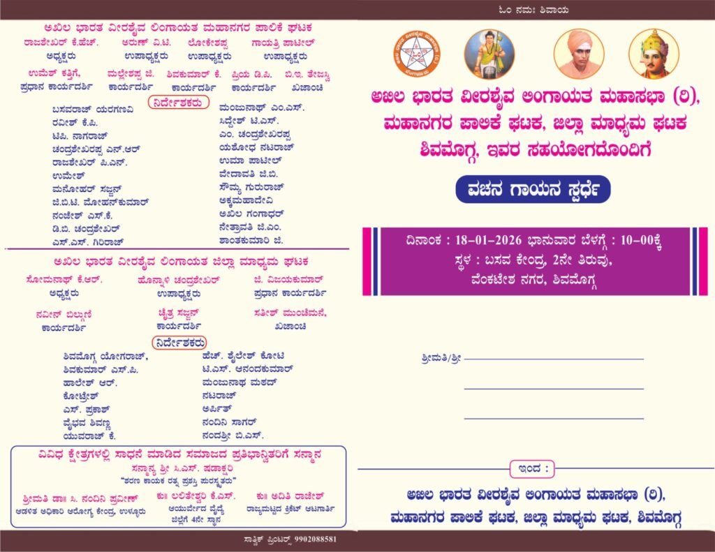 ಶಿವಮೊಗ್ಗ: ಇಂದಿನ ತಂತ್ರಜ್ಞಾನಾಧಾರಿತ ಜೀವನ ಶೈಲಿಯಲ್ಲಿ ಯುವಜನತೆ ಹಳೆಯ ಸಂಸ್ಕೃತಿ, ಆಚಾರ-ವಿಚಾರಗಳು ಹಾಗೂ ಶರಣ ಸಂಸ್ಕೃತಿ ಯಿಂದ ನಿಧಾನವಾಗಿ ದೂರವಾಗುತ್ತಿರುವುದು ಸಮಾಜದ ಮುಂದಿರುವ ದೊಡ್ಡ ಸವಾಲಾಗಿದೆ. ಇಂತಹ ಸಂದರ್ಭದಲ್ಲಿ ವೀರಶೈವ ಲಿಂಗಾಯತ ಸಮಾಜದ ಮೂಲ ಮೌಲ್ಯಗಳಾದ ವಚನ ಸಾಹಿತ್ಯ, ಗುರುಪರಂಪರೆ ಮತ್ತು ಶರಣರ ತತ್ವಚಿಂತನೆಯನ್ನು ಯುವ ಮನಸ್ಸುಗಳಿಗೆ ತಲುಪಿಸುವ ಉದ್ದೇಶದಿಂದ ಅಖಿಲ ಭಾರತ ವೀರಶೈವ ಲಿಂಗಾಯತ ಮಹಾಸಭಾ (ರಿ), ಮಹಾನಗರ ಪಾಲಿಕೆ ಘಟಕ ಹಾಗೂ ಜಿಲ್ಲಾ ಮಾಧ್ಯಮ ಘಟಕ, ಶಿವಮೊಗ್ಗ ಇವರ ಸಹಯೋಗದಲ್ಲಿ ವಚನ ಗಾಯನ ಸ್ಪರ್ಧೆ ಹಾಗೂ ಸಮಾಜದ ಪ್ರತಿಭಾನ್ವಿತರಿಗೆ ಸನ್ಮಾನ ಕಾರ್ಯಕ್ರಮವನ್ನು ಆಯೋಜಿಸಲಾಗಿದೆ ಎಂದು ಮಹಾನಗರ ಪಾಲಿಕೆ ಘಟಕದ ಅಧ್ಯಕ್ಷ ರಾಜಶೇಖರ್ ಹೆಚ್.ಕೆ. ತಿಳಿಸಿದ್ದಾರೆ.