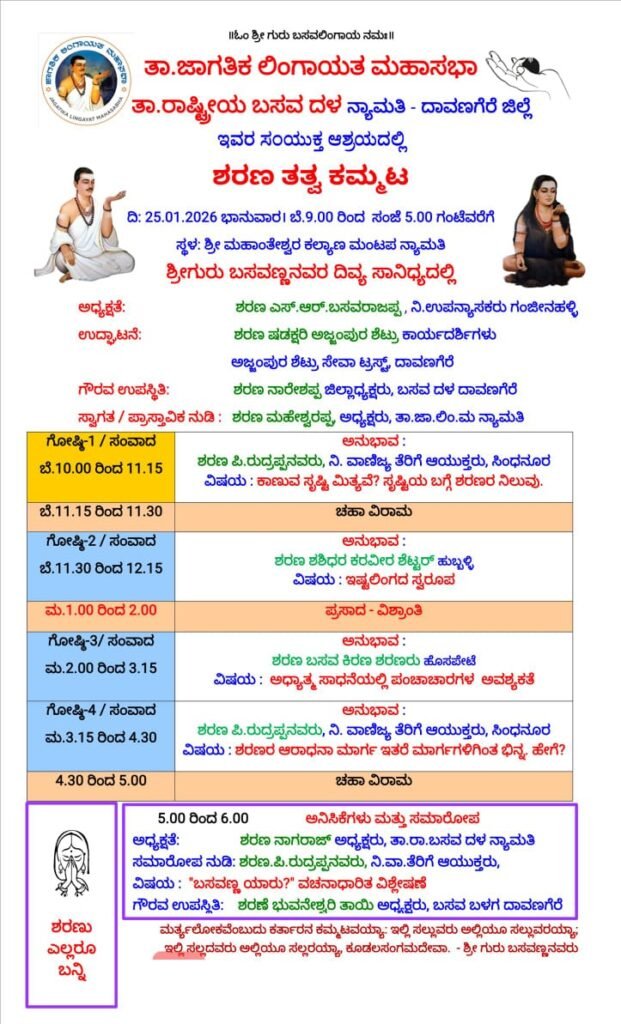 ಜನವರಿ 25ರಂದು ನ್ಯಾಮತಿಯಲ್ಲಿ ಜಾಗತಿಕ ಲಿಂಗಾಯತ ಮಹಾಸಭಾ–ಬಸವದಳ ಸಂಯುಕ್ತ ಆಶ್ರಯದಲ್ಲಿ “ಶರಣ ತತ್ವ ಕಮ್ಮಟ”