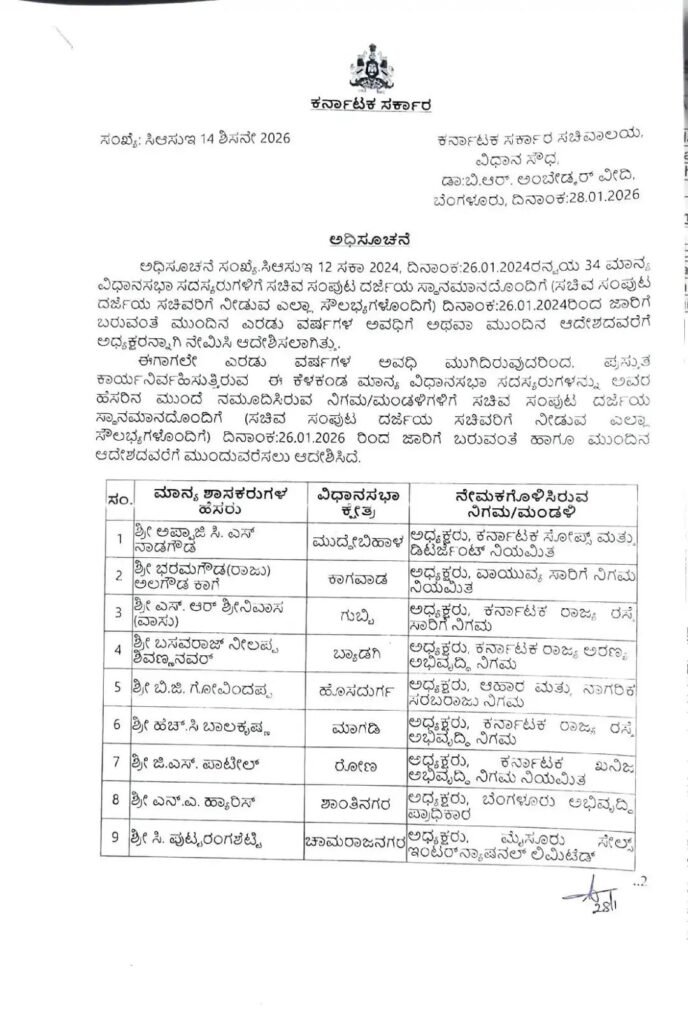 ಆದೇಶದಂತೆ, ಚಳ್ಳಕೆರೆ ವಿಧಾನಸಭಾ ಕ್ಷೇತ್ರದ ಶಾಸಕ ಟಿ. ರಘುಮೂರ್ತಿ ಅವರನ್ನು ಕರ್ನಾಟಕ ರಾಜ್ಯ ಸಣ್ಣ ಕೈಗಾರಿಕೆಗಳ ಅಭಿವೃದ್ಧಿ ನಿಗಮದ ಅಧ್ಯಕ್ಷರನ್ನಾಗಿ ಮುಂದುವರೆಸಲಾಗಿದೆ. ಅದೇ ರೀತಿಯಾಗಿ ಸಾಗರ ಕ್ಷೇತ್ರದ ಶಾಸಕ ಗೋಪಾಲಕೃಷ್ಣ ಬೇಳೂರು ಅವರನ್ನು ಕರ್ನಾಟಕ ರಾಜ್ಯ ಅರಣ್ಯ ಕೈಗಾರಿಕೆಗಳ ನಿಗಮ ನಿಯಮಿತದ ಅಧ್ಯಕ್ಷರ ಸ್ಥಾನದಲ್ಲೇ ಮುಂದುವರಿಸಲಾಗಿದೆ.