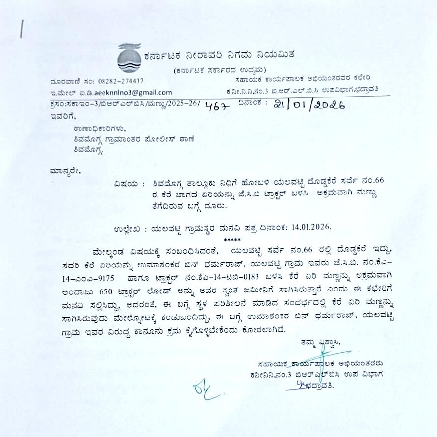 ಈ ಸಂಬಂಧ ಯಲವಟ್ಟಿ ಗ್ರಾಮಸ್ಥರು ದಿನಾಂಕ 14.01.2026ರಂದು ಸಂಬಂಧಪಟ್ಟ ಅಧಿಕಾರಿಗಳಿಗೆ ಲಿಖಿತ ಮನವಿ ಸಲ್ಲಿಸಿದ್ದರು. ಅದರ ಮೇರೆಗೆ 21.01.2026ರಂದು ಸಹಾಯಕ ಕಾರ್ಯಪಾಲಕ ಅಭಿಯಂತರರು, ಕನೀನಿ ನಂ.3, ಬಿಆರ್ಎಲ್ಬಿಸಿ ಉಪವಿಭಾಗ ಭದ್ರಾವತಿ ಇವರು ಸ್ಥಳ ಪರಿಶೀಲನೆ ನಡೆಸಿದ್ದು, ಕೆರೆ ಏರಿಯಿಂದ ಮಣ್ಣು ಸಾಗಿಸಿರುವುದು ಮೇಲ್ನೋಟಕ್ಕೆ ದೃಢಪಟ್ಟಿದೆ. ಆರೋಪಿತ ಉಮಾಶಂಕರ ಬಿನ್ ಧರ್ಮರಾಜ್ ವಿರುದ್ಧ ಕಾನೂನು ಕ್ರಮ ಕೈಗೊಳ್ಳುವಂತೆ ಅವರು ಶಿಫಾರಸು ಮಾಡಿರುವುದಾಗಿ ತಿಳಿದುಬಂದಿದೆ.