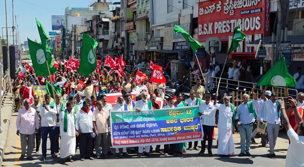 ಶಿವಮೊಗ್ಗ: ಸಂಯುಕ್ತ ಹೋರಾಟ–ಕರ್ನಾಟಕ ಹಾಗೂ ಜೆ.ಸಿ.ಟಿ.ಯು (JCTU) ಕರೆಯ ಹಿನ್ನೆಲೆಯಲ್ಲಿ ಇಂದು ಶಿವಮೊಗ್ಗದಲ್ಲಿ ಅಖಿಲ ಭಾರತ ಸಾರ್ವತ್ರಿಕ ಮುಷ್ಕರವನ್ನು ಕರ್ನಾಟಕ ರಾಜ್ಯ ರೈತ ಸಂಘದ ರಾಜ್ಯಾಧ್ಯಕ್ಷ ಹೆಚ್.ಆರ್. ಬಸವರಾಜಪ್ಪ ಅವರ ನೇತೃತ್ವದಲ್ಲಿ ನಡೆಸಲಾಯಿತು. ರೈತರು, ದಲಿತರು ಮತ್ತು ಕಾರ್ಮಿಕರು ಒಗ್ಗಟ್ಟಿನಿಂದ ಭಾಗವಹಿಸಿ ಕೇಂದ್ರ ಹಾಗೂ ರಾಜ್ಯ ಸರ್ಕಾರಗಳ ವಿರುದ್ಧ ಆಕ್ರೋಶ ವ್ಯಕ್ತಪಡಿಸಿದರು.
