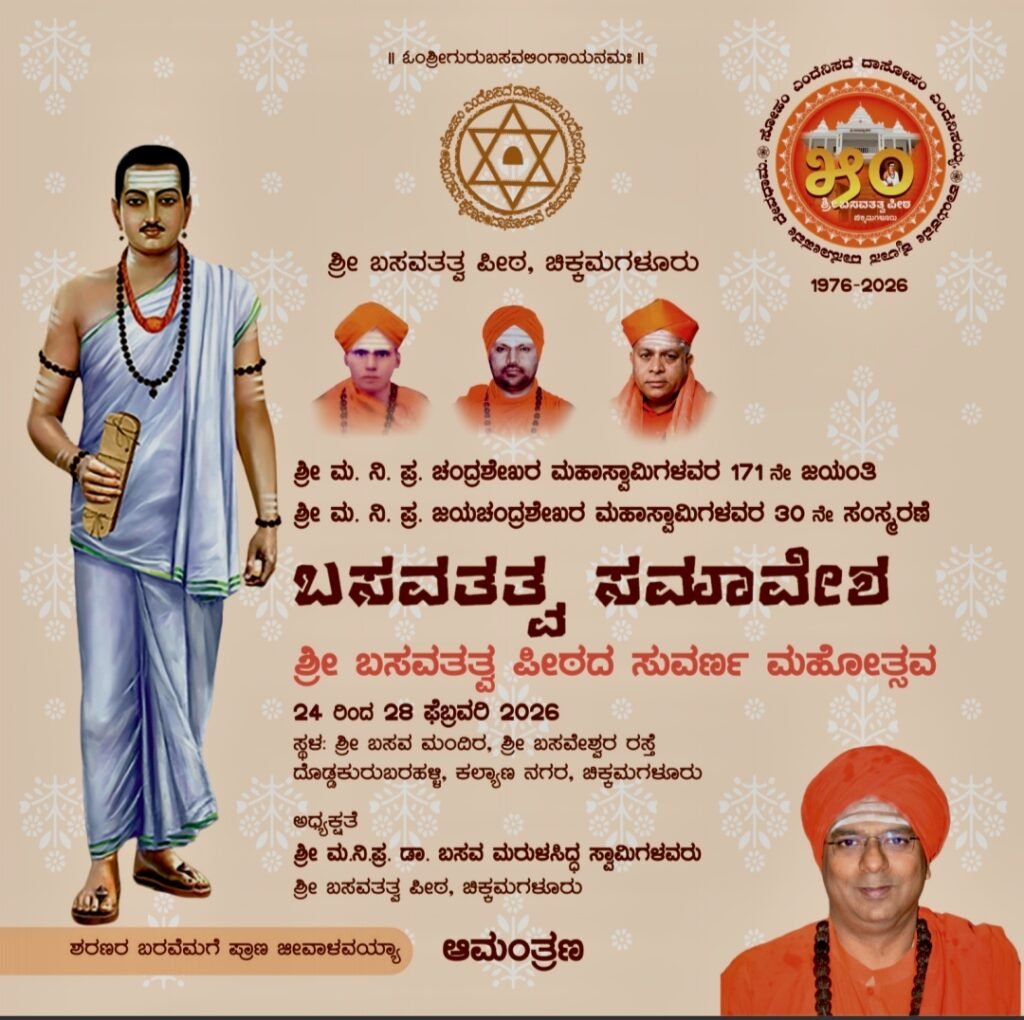 ಚಿಕ್ಕಮಗಳೂರು: ಚಿಕ್ಕಮಗಳೂರಿನ ಶ್ರೀ ಬಸವೇಶ್ವರ ರಸ್ತೆಯಲ್ಲಿರುವ ಶ್ರೀ ಬಸವ ಮಂದಿರದಲ್ಲಿ 2026ರ ಫೆಬ್ರವರಿ 24ರಿಂದ 28ರವರೆಗೆ ಐದು ದಿನಗಳ ಕಾಲ ಶ್ರೀ ಬಸವತತ್ವ ಪೀಠದ ಸುವರ್ಣ ಮಹೋತ್ಸವ ಹಾಗೂ ಭವ್ಯ ಬಸವತತ್ವ ಸಮಾವೇಶವು ಭಕ್ತಿಭಾವ, ತತ್ವಚಿಂತನೆ ಮತ್ತು ಸಾಂಸ್ಕೃತಿಕ ಸಂಭ್ರಮದೊಂದಿಗೆ ನಡೆಯಲಿದೆ.