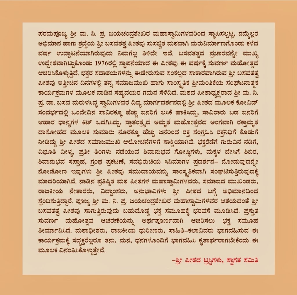 ಸುವರ್ಣ ಮಹೋತ್ಸವವು ಕೇವಲ ಒಂದು ಆಚರಣೆಯಲ್ಲ; ಅದು ಐವತ್ತು ವರ್ಷದ ತತ್ವಸಾಧನೆಯ ಸಂಭ್ರಮ. ಪೂಜ್ಯ ಶ್ರೀ ಮ.ನಿ.ಪ್ರ. ಜಯಚಂದ್ರಶೇಖರ ಮಹಾಸ್ವಾಮಿಗಳವರ ಆಶಯದಂತೆ ಸಾಗುತ್ತಿರುವ ಶ್ರೀ ಬಸವತತ್ವ ಪೀಠವು ಇಂದಿಗೂ ಬಸವತತ್ವದ ದೀಪವನ್ನು ಪ್ರಜ್ವಲಿಸುತ್ತಿದೆ.