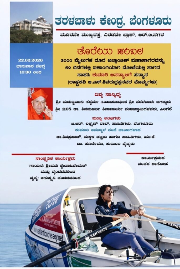 ಬೆಂಗಳೂರು: ಸಾಹಸ, ಸಂಕಲ್ಪ ಮತ್ತು ಸ್ವಾಭಿಮಾನಗಳ ಸಮನ್ವಯವಾಗಿರುವ ಅಪರೂಪದ ಸಾಧಕಿಯನ್ನು ಸನ್ಮಾನಿಸಲು ನಾಳೆ ತರಳಬಾಳು ಕೇಂದ್ರದಲ್ಲಿ ಭಕ್ತಿಪೂರ್ವಕ ಹಾಗೂ ವೈಭವಯುತ ಕಾರ್ಯಕ್ರಮ ಆಯೋಜಿಸಲಾಗಿದೆ. ರಾಷ್ಟ್ರಕವಿ ಜಿ.ಎಸ್. ಶಿವರುದ್ರಪ್ಪ ಅವರ ಮೊಮ್ಮಗಳಾದ ಅನನ್ಯಾ ಶಿವಪ್ರಸಾದ್ ಅವರು ಅಟ್ಲಾಂಟಿಕ್ ಮಹಾಸಾಗರವನ್ನು ಏಕಾಂಗಿಯಾಗಿ ದಾಟಿ ವಿಶ್ವದ ಗಮನ ಸೆಳೆದಿರುವ ಹಿನ್ನೆಲೆ, ‘ತೊರೆಯ ಹಂಬಲ’ ಎಂಬ ಶೀರ್ಷಿಕೆಯಲ್ಲಿ ಅಭಿನಂದನಾ ಸಮಾರಂಭ ನಡೆಯಲಿದೆ.