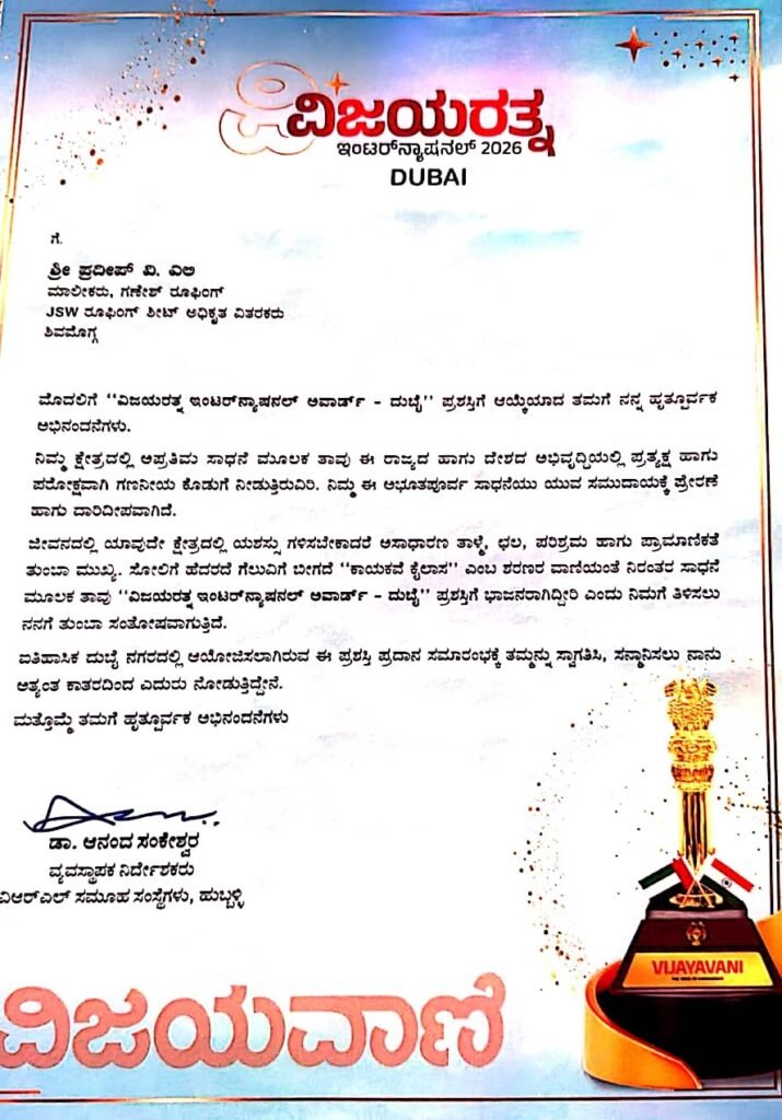 ದುಬೈ: ದುಬೈನಲ್ಲಿ 28ನೇ ಶನಿವಾರ, ಫೆಬ್ರವರಿ 2026 ರಂದು ನಡೆಯಲಿರುವ “ವಿಜಯರತ್ನ ಇಂಟರ್ನ್ಯಾಷನಲ್ 2026” ಪ್ರಶಸ್ತಿ ಪ್ರದಾನ ಸಮಾರಂಭವು ಜಾಗತಿಕ ಮಟ್ಟದಲ್ಲಿ ಗಮನ ಸೆಳೆಯುತ್ತಿದೆ. ಈ ಭವ್ಯ ಕಾರ್ಯಕ್ರಮದಲ್ಲಿ ಶಿವಮೊಗ್ಗ ಜಿಲ್ಲೆಯ ಯುವ ಉದ್ಯಮಿ ಹಾಗೂ ಸಮಾಜಮುಖಿ ನಾಯಕ ಶ್ರೀ ಪ್ರದೀಪ್ ವಿ.ಎಲಿ ಅವರು ಗೌರವಾನ್ವಿತರಾಗಲಿರುವುದು ಜಿಲ್ಲೆಯಷ್ಟೇ ಅಲ್ಲ, ರಾಜ್ಯದ ಹೆಮ್ಮೆಯ ಕ್ಷಣವಾಗಲಿದೆ. ಗಣೇಶ್ ರೂಫಿಂಗ್ ಸಂಸ್ಥೆಯ ಮಾಲೀಕರಾಗಿದ್ದು, JSW ರೂಫಿಂಗ್ ಶೀಟ್ಗಳ ಅಧಿಕೃತ ವಿತರಕರಾಗಿ ತಮ್ಮ ಕ್ಷೇತ್ರದಲ್ಲಿ ಅಪ್ರತಿಮ ಸಾಧನೆ ಮಾಡಿದ ಅವರು, ವಾಣಿಜ್ಯ ಕ್ಷೇತ್ರದಲ್ಲಿ ಪ್ರಾಮಾಣಿಕತೆ, ಗುಣಮಟ್ಟ ಮತ್ತು ಸೇವಾಭಾವದ ಮೂಲಕ ವಿಶಿಷ್ಟ ಗುರುತು ಮೂಡಿಸಿದ್ದಾರೆ.