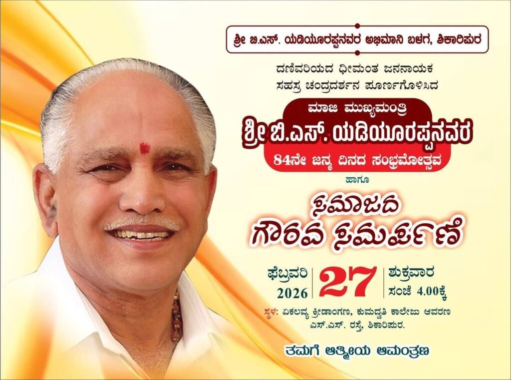ಬಿ.ಎಸ್. ಯಡಿಯೂರಪ್ಪನವರ 84ನೇ ವರ್ಷದ ಜನ್ಮದಿನದ ಪ್ರಯುಕ್ತ ದಿನಾಂಕ 27ರಂದು ಶಿಕಾರಿಪುರದಲ್ಲಿ ವಿವಿಧ ಕಾರ್ಯಕ್ರಮಗಳು ಆಯೋಜಿಸಲಾಗಿವೆ. ಈ ಸಂದರ್ಭದಲ್ಲಿ ಯಡಿಯೂರಪ್ಪ ಅವರನ್ನು ಗೌರವಿಸಿ ಅಭಿನಂದಿಸಲು ಬಯಸುವ ಅಭಿಮಾನಿಗಳು, ಸಂಘ–ಸಂಸ್ಥೆಗಳು, ಸಮಾಜದ ಮುಖಂಡರು ಹಾಗೂ ಸಾರ್ವಜನಿಕರಿಗೆ ಬೆಳಿಗ್ಗೆ 9:00 ಗಂಟೆಯಿಂದ ಮಧ್ಯಾಹ್ನ 2:00 ಗಂಟೆಯವರೆಗೆ ಶಿವಮೊಗ್ಗ ರಸ್ತೆಯಲ್ಲಿರುವ ಕುಮದ್ವತಿ ಕಾಲೇಜಿನ ಆಡಿಟೋರಿಯಂನಲ್ಲಿ ವಿಶೇಷ ವ್ಯವಸ್ಥೆ ಮಾಡಲಾಗಿದೆ.
