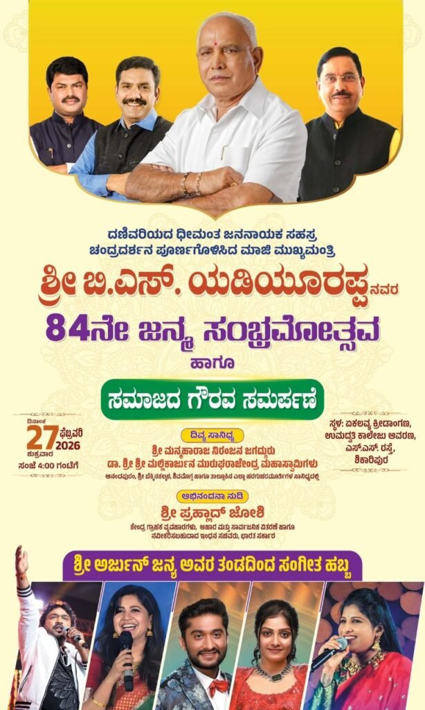 27ರಂದು ಶಿಕಾರಿಪುರದಲ್ಲಿ ಯಡಿಯೂರಪ್ಪ ನವರ ಜನ್ಮದಿನದ ಸಂಭ್ರಮ: ಅರ್ಜುನ್ ಜನ್ಯ ತಂಡದಿಂದ ಸಂಜೆ 7ಕ್ಕೆ ‘ಸಂಗೀತ ಹಬ್ಬ’ ರಸದೌತಣ