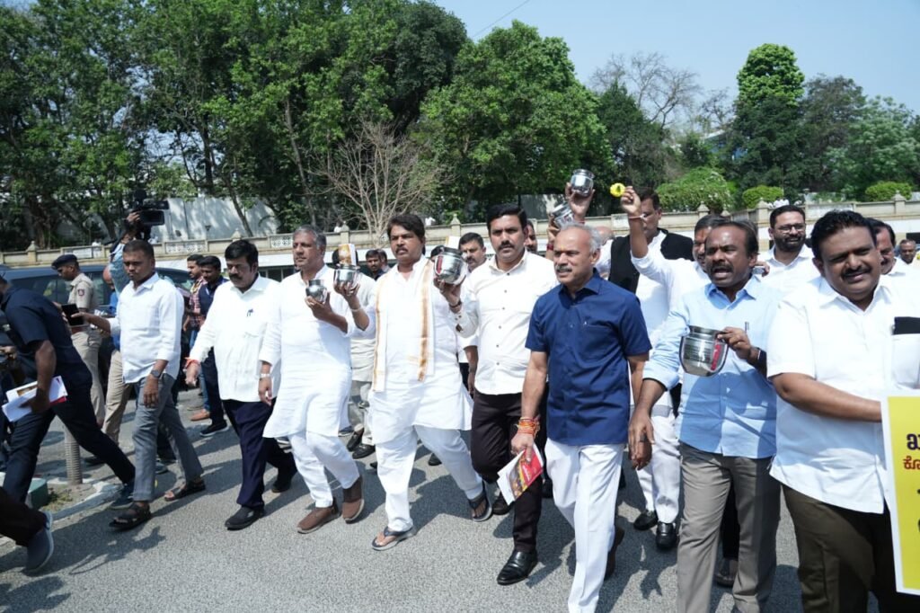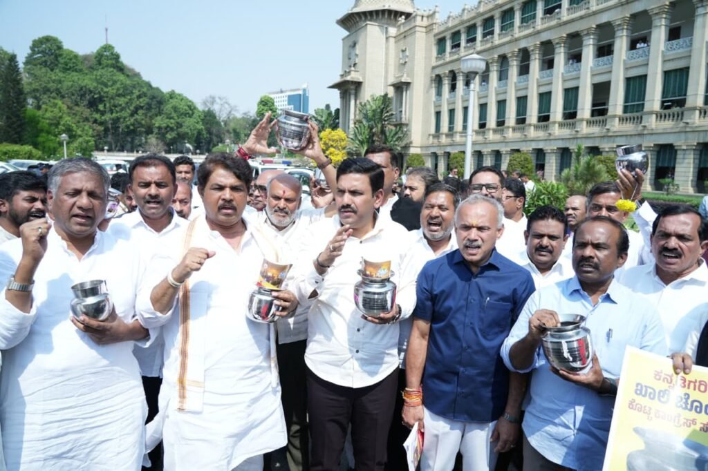 ಬೆಂಗಳೂರು: ಮುಖ್ಯಮಂತ್ರಿ ಸಿದ್ದರಾಮಯ್ಯ ಮಂಡಿಸಿದ ರಾಜ್ಯ ಬಜೆಟ್ ‘ಖಾಲಿ ಚೊಂಬಿನಂತಿದೆ’ ಎಂದು ಆರೋಪಿಸಿ ಭಾರತೀಯ ಜನತಾ ಪಕ್ಷದ ನಾಯಕರು ಇಂದು ವಿಧಾನಸೌಧದ ಬಳಿ ಪ್ರತಿಭಟನೆ ನಡೆಸಿದರು.