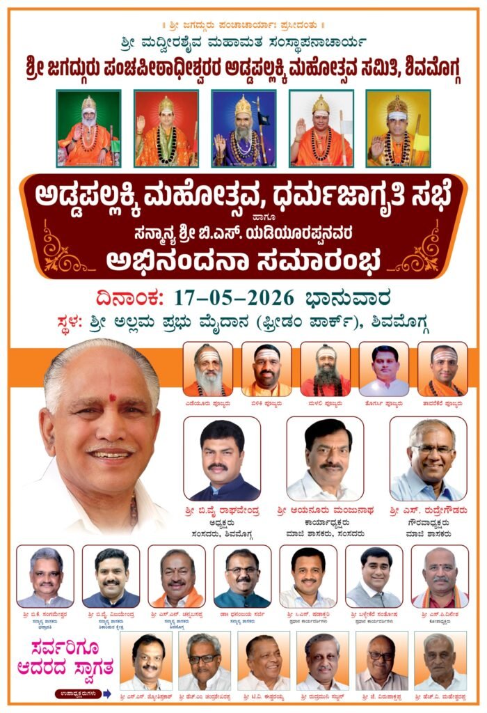 ಶಿವಮೊಗ್ಗ: ನಗರದ ಶ್ರೀ ಅಲ್ಲಮಪ್ರಭು ಮೈದಾನ (ಫ್ರೀಡಂ ಪಾರ್ಕ್) ನಲ್ಲಿ ದಿನಾಂಕ 17-05-2026ರ ಭಾನುವಾರದಂದು ನಡೆಯಲಿರುವ ಶ್ರೀ ಜಗದ್ಗುರು ಪಂಚಪೀಠಾಧೀಶ್ವರರ ಅಡ್ಡಪಲ್ಲಕ್ಕಿ ಮಹೋತ್ಸವ, ಧರ್ಮಜಾಗೃತಿ ಸಭೆ ಹಾಗೂ ರಾಜ್ಯದ ಹೆಮ್ಮೆಯ ಮಾಜಿ ಮುಖ್ಯಮಂತ್ರಿ ಸನ್ಮಾನ್ಯ ಬಿ.ಎಸ್. ಯಡಿಯೂರಪ್ಪ ನವರ ಅಭಿನಂದನಾ ಸಮಾರಂಭವು ಶಿವಮೊಗ್ಗ ಜಿಲ್ಲೆಯಷ್ಟೇ ಅಲ್ಲ, ರಾಜ್ಯದ ಮಟ್ಟದಲ್ಲಿ ಮಹತ್ವದ ಧಾರ್ಮಿಕ-ಸಾಮಾಜಿಕ ಉತ್ಸವವಾಗಿ ರೂಪುಗೊಳ್ಳುತ್ತಿದೆ. ಈ ಮಹೋತ್ಸವವು ಬಸವೇಶ್ವರ ವೀರಶೈವ ಲಿಂಗಾಯತ ಸಮಾಜದ ಶತಮಾನೋತ್ಸವದ ಸಂಭ್ರಮದೊಂದಿಗೆ ನಡೆಯುತ್ತಿರುವುದು ವಿಶೇಷವಾಗಿದೆ.
