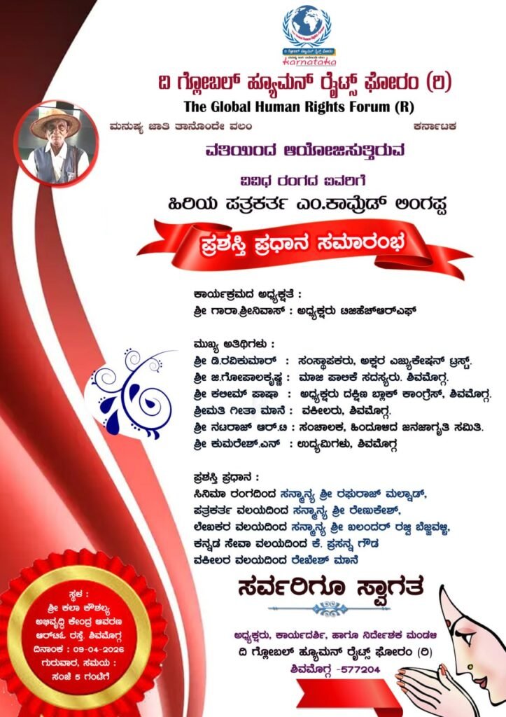 ಶಿವಮೊಗ್ಗ: ಹಿರಿಯ ಪತ್ರಕರ್ತರು ಹಾಗೂ ಸಮಾಜಮುಖಿ ಹೋರಾಟಗಾರರಾದ ಕಾಮ್ರೆಡ್ ಎಂ. ಲಿಂಗಪ್ಪ ಅವರ ಸ್ಮರಣಾರ್ಥವಾಗಿ, ವಿವಿಧ ಕ್ಷೇತ್ರಗಳಲ್ಲಿ ಗಣನೀಯ ಸೇವೆ ಸಲ್ಲಿಸಿರುವ ಐವರಿಗೆ “ಕಾಮ್ರೆಡ್ ಎಂ. ಲಿಂಗಪ್ಪ ಪ್ರಶಸ್ತಿ” ಪ್ರದಾನ ಮಾಡುವ ಸಮಾರಂಭವನ್ನು ಏಪ್ರಿಲ್ 9ರಂದು ಶಿವಮೊಗ್ಗ ನಗರದಲ್ಲಿ ಆಯೋಜಿಸಲಾಗಿದೆ ಎಂದು ದಿ ಗ್ಲೋಬಲ್ ಹ್ಯೂಮನ್ ರೈಟ್ಸ್ ಫೋರಂ ಸಂಸ್ಥೆ ತಿಳಿಸಿದೆ.