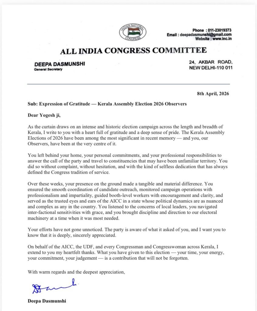 ಕೇರಳ ವಿಧಾನಸಭಾ ಚುನಾವಣೆ 2026 ರ ಉತ್ಸಾಹಭರಿತ ಹಾಗೂ ಮಹತ್ವದ ಪ್ರಚಾರ ಕಾರ್ಯಗಳು ಮುಕ್ತಾಯದ ಹಂತಕ್ಕೆ ಸಾಗುತ್ತಿರುವ ಸಂದರ್ಭದಲ್ಲಿ ಎಐಸಿಸಿ ಪರವಾಗಿ ಚುನಾವಣಾ ಪ್ರಕ್ರಿಯೆಯಲ್ಲಿ ವೀಕ್ಷಕರಾಗಿ ಕಾರ್ಯನಿರ್ವಹಿಸಿದ ಎಚ್.ಸಿ. ಯೋಗೇಶ್ ಅವರ ಸೇವೆಯನ್ನು ಎಐಸಿಸಿ ನಾಯಕಿ ದೀಪಾ ದಾಸ್ ಮುನ್ಷಿ ಅವರು ಮನಪೂರ್ವಕವಾಗಿ ಶ್ಲಾಘಿಸಿ, ಕೃತಜ್ಞತೆ ಹಾಗೂ ಮೆಚ್ಚುಗೆಯನ್ನು ವ್ಯಕ್ತಪಡಿಸಿದ್ದಾರೆ.