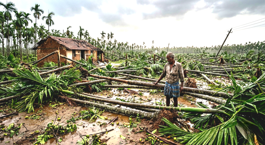ಕಳೆದ ರಾತ್ರಿ ಸುರಿದ ಗಾಳಿ-ಮಳೆಗೆ ಜಿಲ್ಲೆಯ ಪ್ರಮುಖ ವಾಣಿಜ್ಯ ಬೆಳೆಯಾದ ಅಡಿಕೆ ತೋಟಗಳು ನೆಲಸಮವಾಗಿವೆ. ಸಾವಿರಾರು ಅಡಿಕೆ ಮರಗಳು ಬುಡಸಮೇತ ಉರುಳಿದ್ದು, ದಶಕಗಳ ಕಾಲ ಬೆಳೆಸಿದ ತೋಟ ಕಣ್ಣೆದುರೇ ನಾಶವಾಗಿರುವುದನ್ನು ಕಂಡು ರೈತರು ಕಣ್ಣೀರು ಹಾಕುತ್ತಿದ್ದಾರೆ. ಅಡಿಕೆ ಮಾತ್ರವಲ್ಲದೆ, ಕೊಯ್ಲಿಗೆ ಬಂದಿದ್ದ ಬಾಳೆ ಹಾಗೂ ಇತರೆ ತೋಟಗಾರಿಕಾ ಬೆಳೆಗಳು ಮಣ್ಣು ಪಾಲಾಗಿವೆ.
